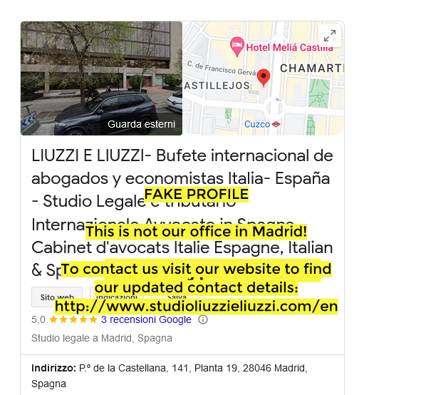 Por favor atención ya que existe en Google un perfil falso que indica que nuestro Bufete se encuentra en la dirección siguiente en Madrid y esto es falso. No tenemos ninguna oficina allí. Por favor para ponerse en contacto con nuestro Bufete es imprescindible visitar nuestra web oficial en la que pueden encontrar nuestros datos de contacto presionar aquí para contactarnos.